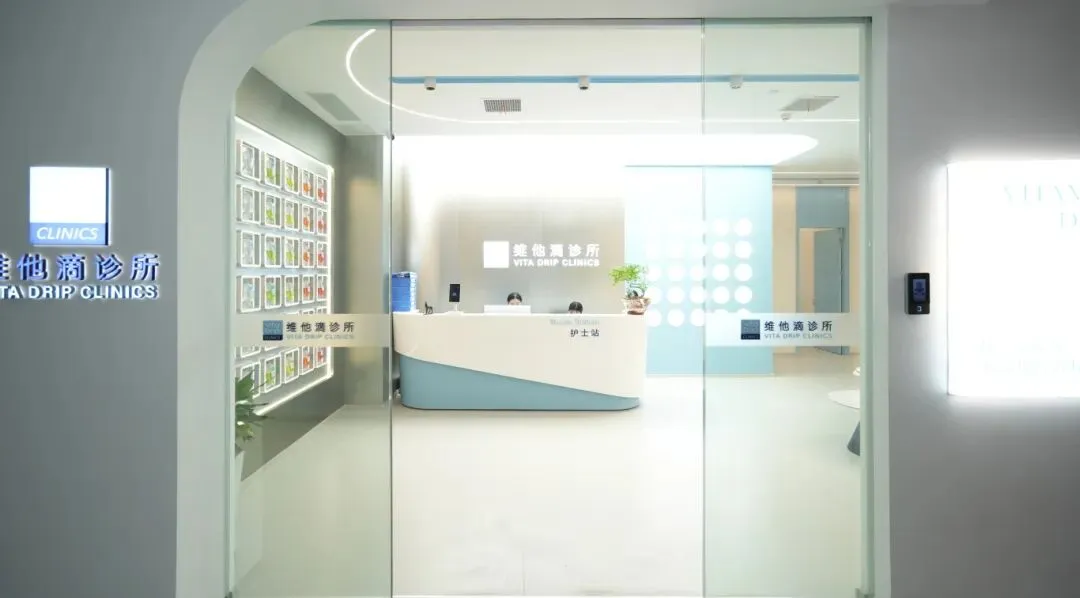 推开维他滴诊所的玻璃门,便是中投装饰为空间打造的第一重视觉惊喜。弧形玻璃门以柔和的线条消解了医疗空间的严肃感,门体上 “维他滴诊所 VITA DRIP CLINICS” 的发光标识简洁大气,与右侧 “每一滴都是永远年轻的秘密” 的光影灯箱相映成趣,既传递了品牌理念,也奠定了空间雅致、高级的基调。