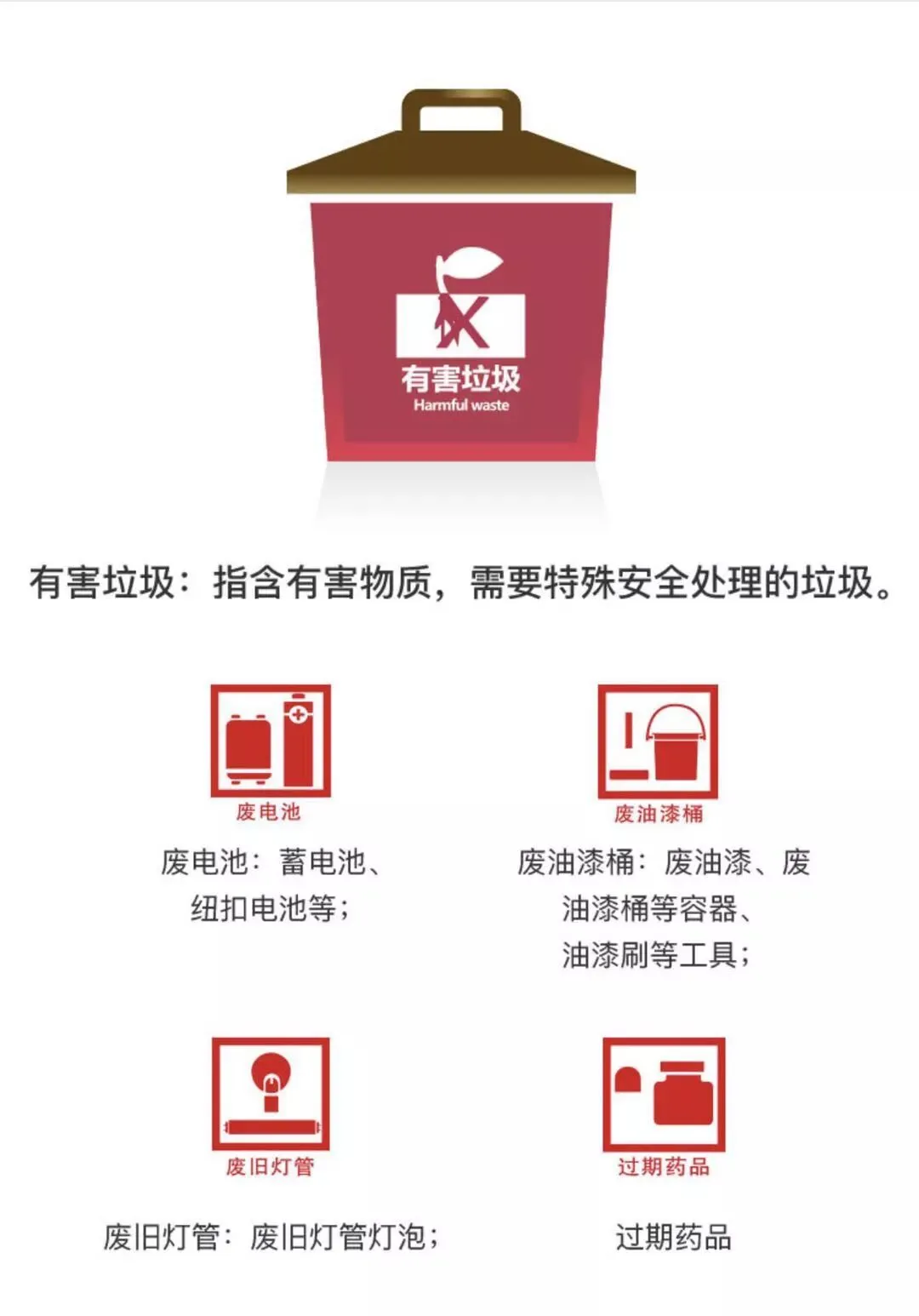 方案指出,居民小区及单位将设置废电池、废荧光灯管、过期药品、过期化妆品等有害垃圾专用回收容器,居民小区和单位零星产生的有害垃圾(不含工业垃圾)由各县(市、区)、管委会环卫收运企业采用专用车辆进行分类回收,每月5日前定时收运一次,或预约收运时间。对于分类的有害垃圾,由市级环保部门协调有资质企业统一收运处置。