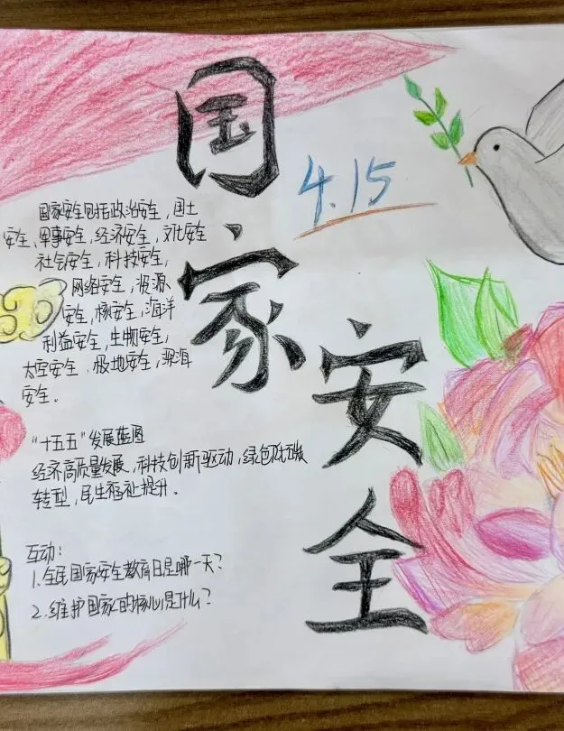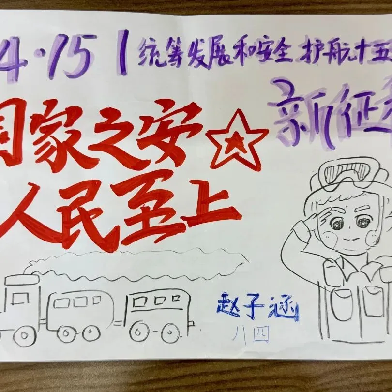 在在第十一个全民国家安全教育日来临之际,郑州经开区八一中学国防宣讲志愿队于4月10日至14日组织开展了“国安在我心”主题手抄报创作活动。全体志愿队成员围绕“统筹发展和安全,护航‘十五五’新征程”这一年度主题,用画笔和文字表达对国家安全的理解,在实践中提升安全意识与宣讲能力。