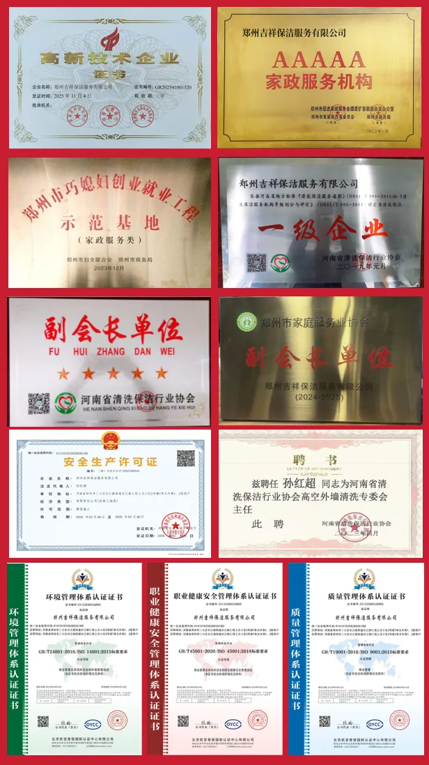 吉祥保洁成立于2011年,公司注册资本501万元,是河南省清洗保洁行业一级资质企业,连续多年被评为省、市先进企业与诚信单位,荣获政府认定的“高新技术企业”“AAAAA级家政服务机构”及“巧媳妇创业就业工程示范基地”称号。