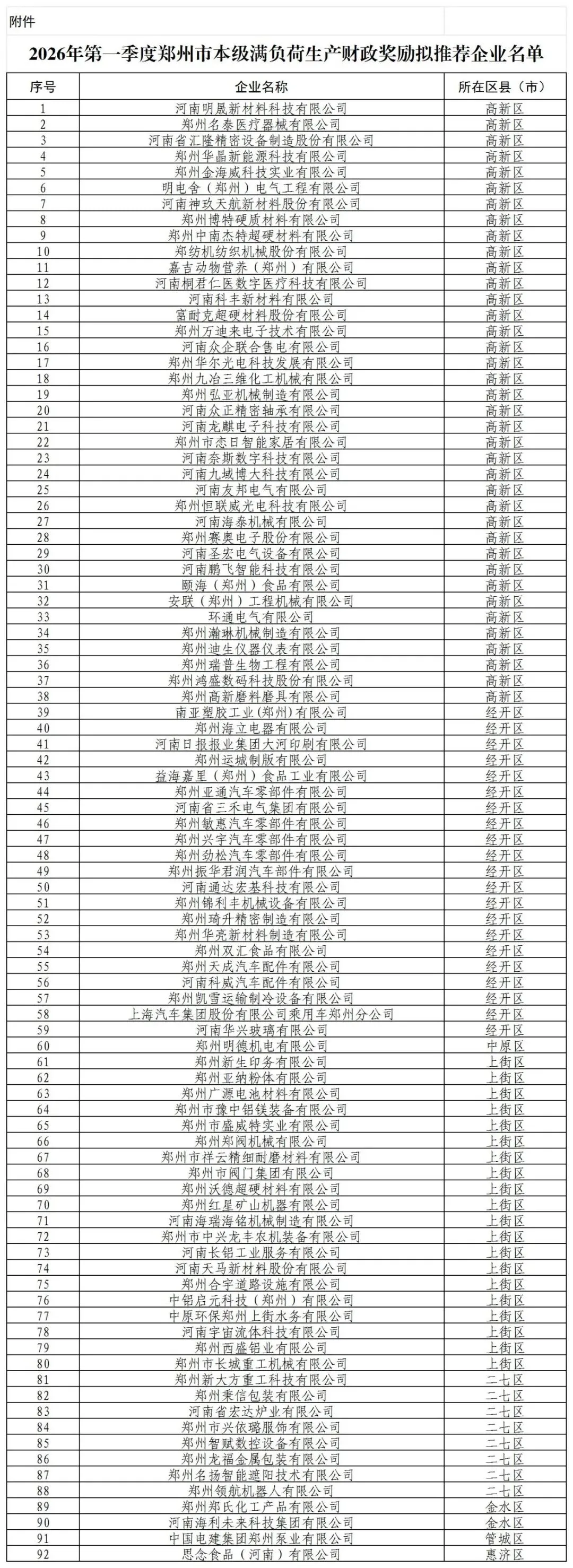 郑州:2026年第一季度规上工业企业满负荷生产财政奖励拟推荐企业公示!
