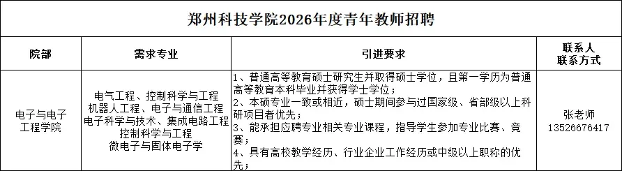 郑州科技学院2026年青年教师招聘公告(电子与电气工程学院)