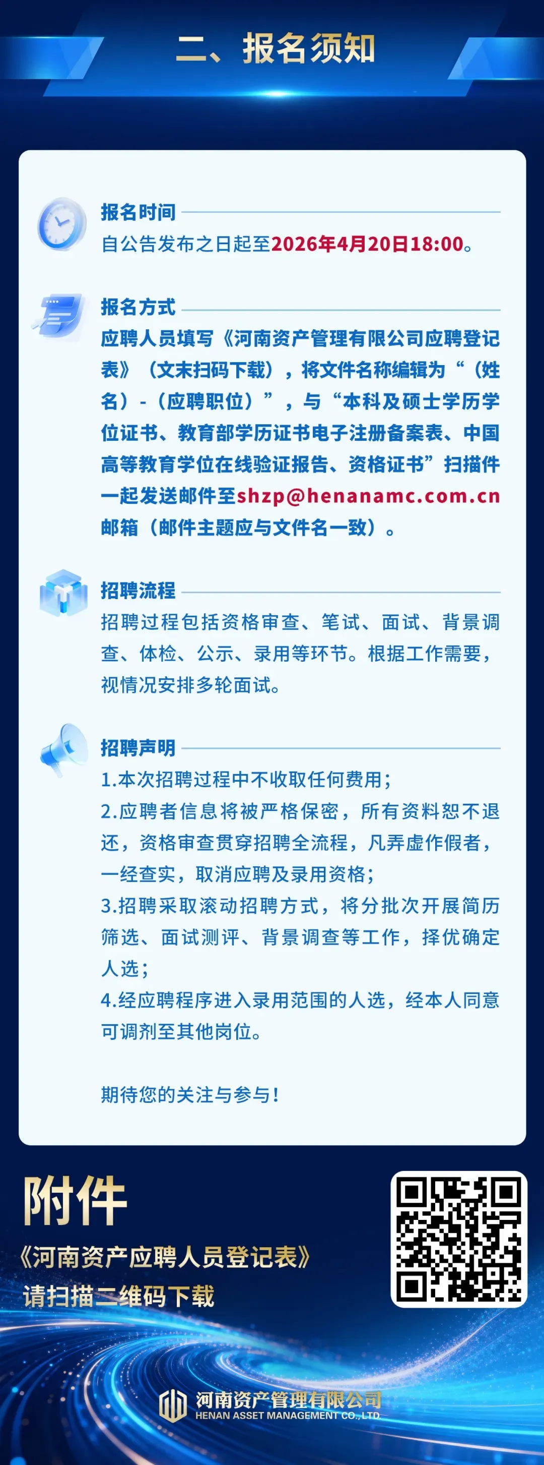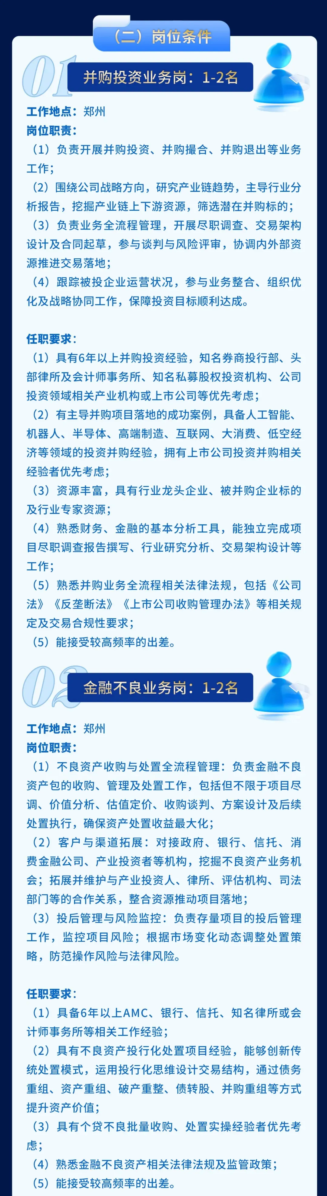 声明:本微信公众号刊载此文,无任何商业目的,纯属公益转发,目的是架起求职者和用人单位之间的桥梁,传递更多的招聘就业信息,请您找工作时候务必高度警惕各类求职陷阱。若来源标注错误或侵犯了您的合法权益,请及时与我们联系,我们将及时更正、删除或依法处理,微信号(含:商务合作):sqdzry。河南资产管理有限公司成立于2017年5月,是经河南省政府批准设立,国家金融监管总局公布名单的地方金融组织,注册资本70亿元,由河南投资集团牵头国家开发投资集团、河南日报报业集团、中原证券、中原信托、中原高速等股东共同设立。成立以来,始终坚持以习近平新时代中国特色社会主义思想为指导,坚守金融工作的政治性、人民性,突出主业、聚焦实业、深耕河南,践行“化解金融风险、服务国企改革、助推产业转型”三大使命,积极服务国家和河南省重大战略,综合运用资产收处、债务重组、市场化债转股、投资投行等金融服务工具,为政府解忧、为银行解难、为企业解困,为地方经济金融稳定健康发展做出了应有贡献。截至目前,公司总资产390亿元,管理资产规模960亿元,资产负债率60%,持续保持中诚信、联合资信双AAA信用评级,有关经验做法被国务院国资委《国企改革三年行动简报》专题刊发,在全国国企改革三年行动推进会上作典型发言,入选“国企混改试点”、“河南省国企改革对标交流对象企业”,荣获“河南省国资国企系统先进基层党组织”、“河南省国企改革三年行动先进单位”、“地方资产管理行业突出贡献奖、优秀管理奖、最佳案例奖”等奖项。