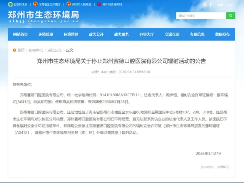 4月1日,郑州市生态环境局在其官网上发布关于停止郑州赛德口腔医院有限公司辐射活动的公告。