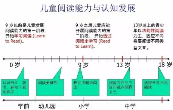 美国的查尔教授曾经提出一个儿童阅读能力与认知发展的横轴,从这个横轴上我们可以看出,9岁也即孩子的三四年级是儿童发展的学习阅读阶段,孩子们必须通过阅读来学习。