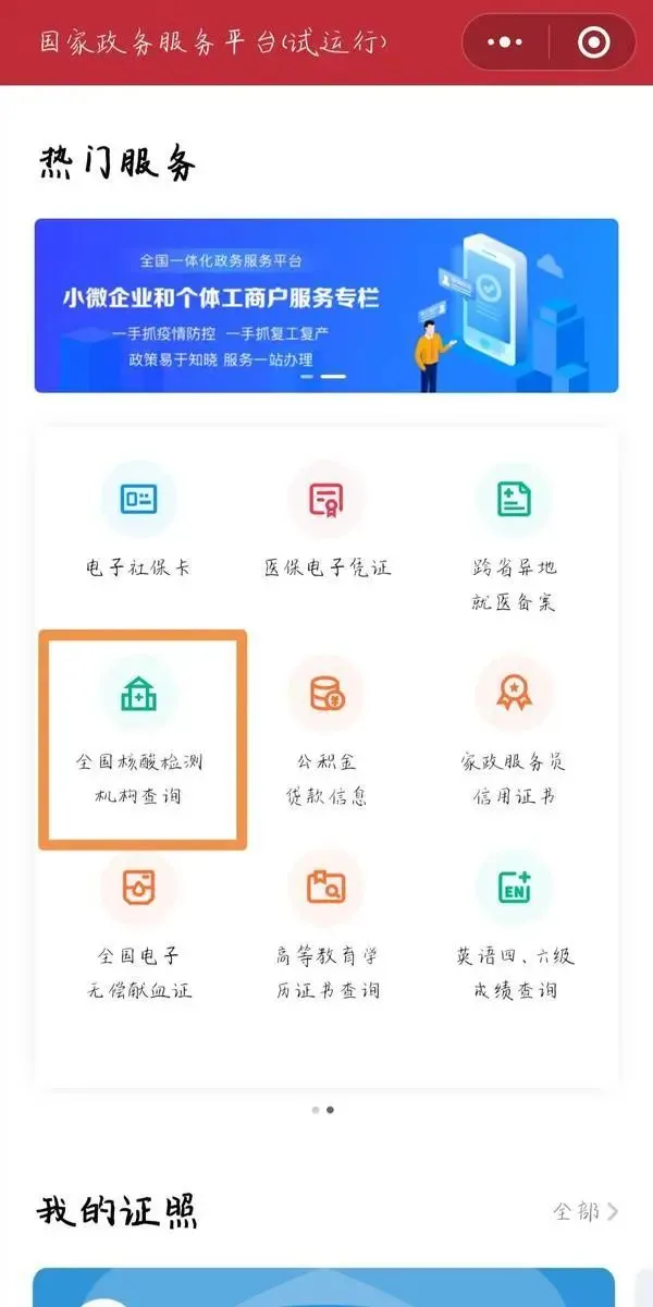 第二步:登录后,找到“全国核酸检测机构查询”;