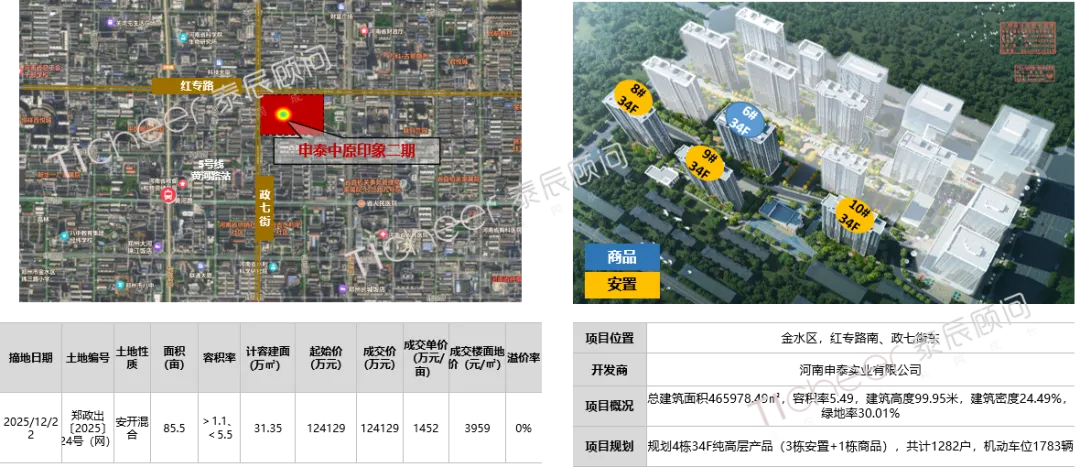 金水区申泰中原印象二期,2025年12月以3959元/㎡楼面价底价摘地,规划4栋34F高层共1282户,其中仅6#楼为商品房,容积率5.49;项目优势:区位核心,配套成熟;项目劣势:高容积率,纯34F高层业态,社区规模大