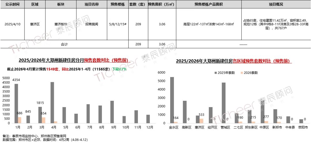 本周1个项目预售前公示,为惠济区招商揽阅,公示4栋楼,209套房源,3.06万㎡;截至目前2026年累计公示预售1549套,同比去年11565套,下降87%