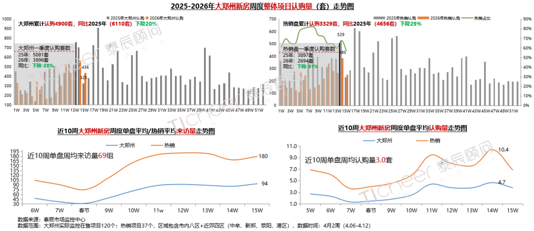 清明假期后热度回落,本周大郑州新房认购436 套,环比下滑23%;累计认购同比下降20%,热销盘认购同比下降29%;