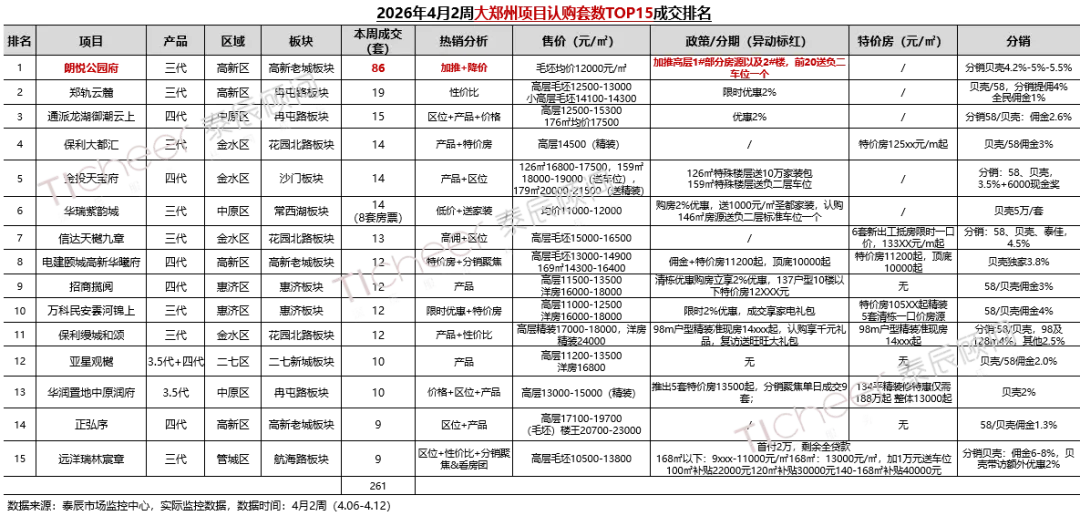 大郑州TOP15榜单合计认购261套,环比上周293套-11%,榜单门槛9套(环比-4套)朗悦公园府上周加推以成交86套领跑,其他项目多靠特价、高佣、限时优惠走量