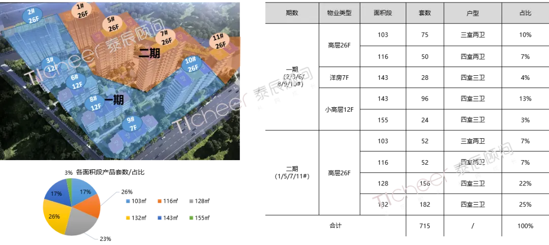 项目分两期开发,一期(2/3/6/8/9/10#)、二期(1/5/7/11#),总套数715户;一期含洋房+小高层+高层,二期以高层大户型为主;面积段103-155㎡,整体产品梯度清晰,覆盖刚需、刚改、改善全客群