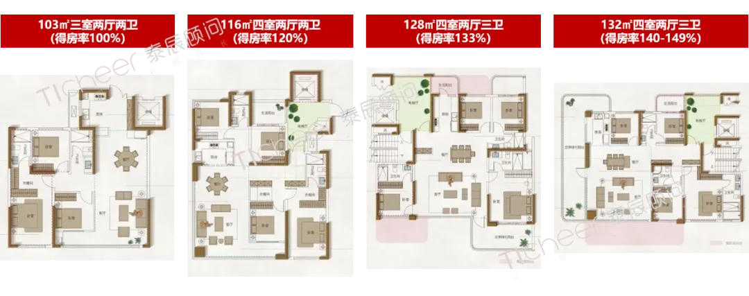高层产品:涵盖103–132㎡三至四房,定位刚需与刚改,空间实用,其中重点116㎡可做到无露台四房设计得房率120%;产品核心亮点:1梯1户设计+电梯厅全明采光+高得房率