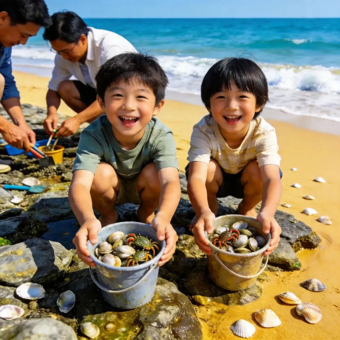 任家台礁石公园(免费,亲子首选)、李家台赶海园(免费)、刘家湾赶海园(45元/人,新手友好)、万宝滨海区(39元/人,收获多)、太公岛牡蛎公园(免费)