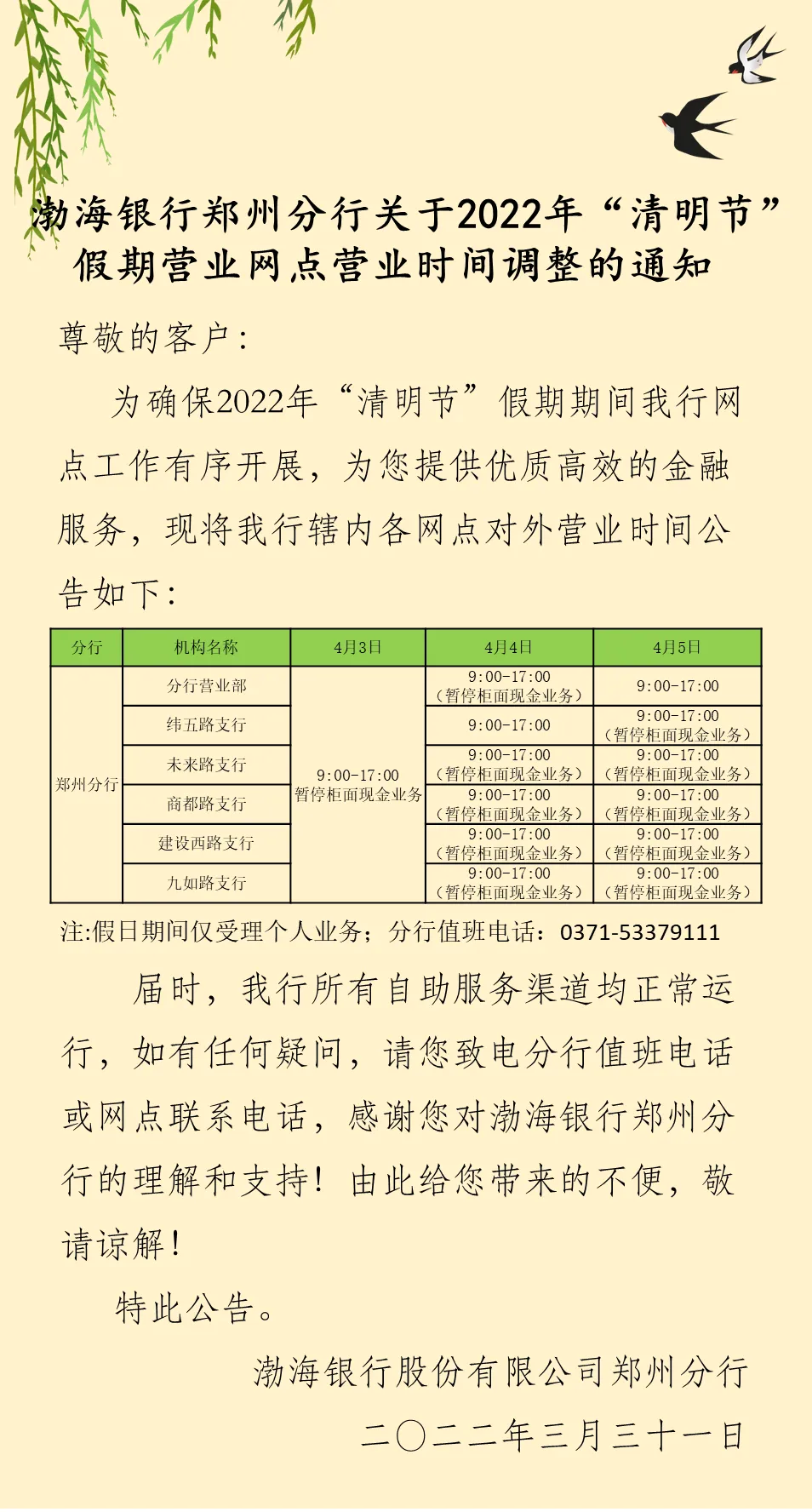 >渤海银行郑州分行关于2022年“清明节”假期营业网点营业时间调整的通知