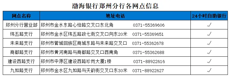 届时,我行所有自助服务渠道均正常运行,如有任何疑问,请您致电分行值班电话或网点联系电话,感谢您对渤海银行郑州分行的理解与支持!由此给您带来的不便,敬请谅解!