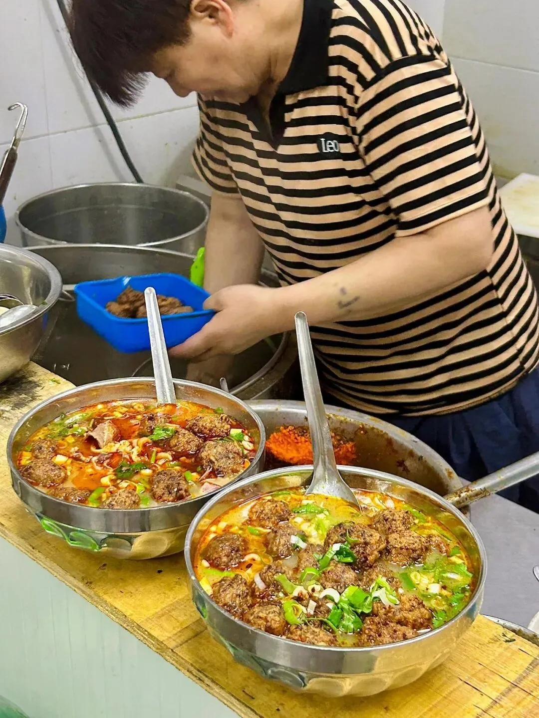 丸子都是老板每天早上现炸的,泡进汤里软乎乎的,咬开还带着鲜香味,一点不柴