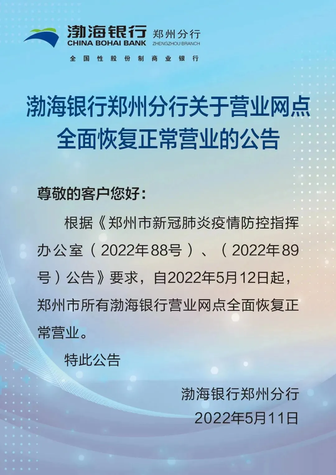 >渤海银行郑州分行关于营业网点全面恢复正常营业的公告