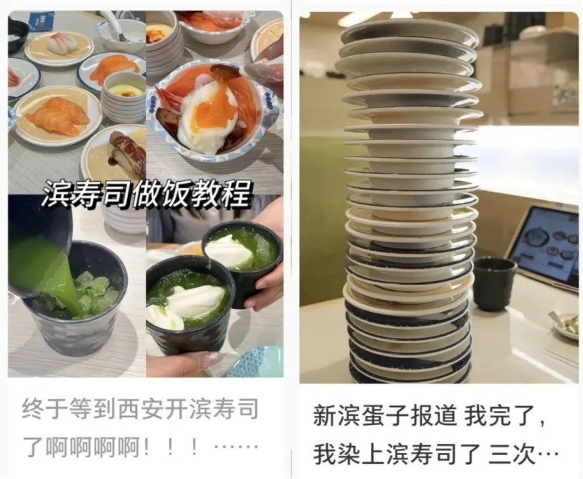 在社交平台上,滨寿司早已成为年轻人的“网红打卡地”:吃完后将空盘叠高拍照,成为餐后必备仪式感;网友们还趣味划分人群:“世界上只有两种人,一种是吃过滨寿司的老滨蛋子,一种是没吃过的新滨蛋子”。
