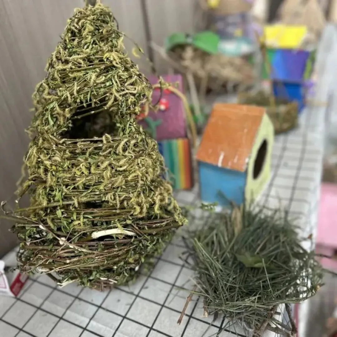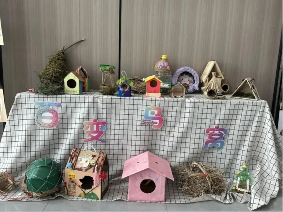 课余时间,总能看到同学们忙碌的身影。他们两两协作,认真拼接每一根材料,反复调整结构的稳固性,不放过任何一个细节。每一个鸟窝都凝聚着同学们的心血,每一处打磨都藏着纯真的爱心。一个个手工鸟窝,模样各不相同,却都装满了孩子们对小动物的温柔与善意。