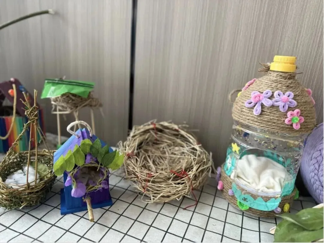 课堂上,老师细致讲解着鸟类的生活习性、鸟窝的搭建原理,同学们听得格外专注,眼中闪烁着对小生命的呵护。从构思设计到材料收集,大家纷纷发挥奇思妙想:有的收集干枯的树枝、苔藓,力求还原自然的巢穴;有的选用柔软的稻草、棉絮,希望为小鸟打造温暖的“床铺”;还有的精心打磨边角,用彩笔细致装饰,让鸟窝既坚固又美观。
