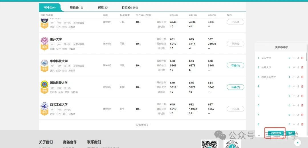 3、依次选择其他意向专业,选择完毕,点击生成志愿单,即可生成填报的志愿单