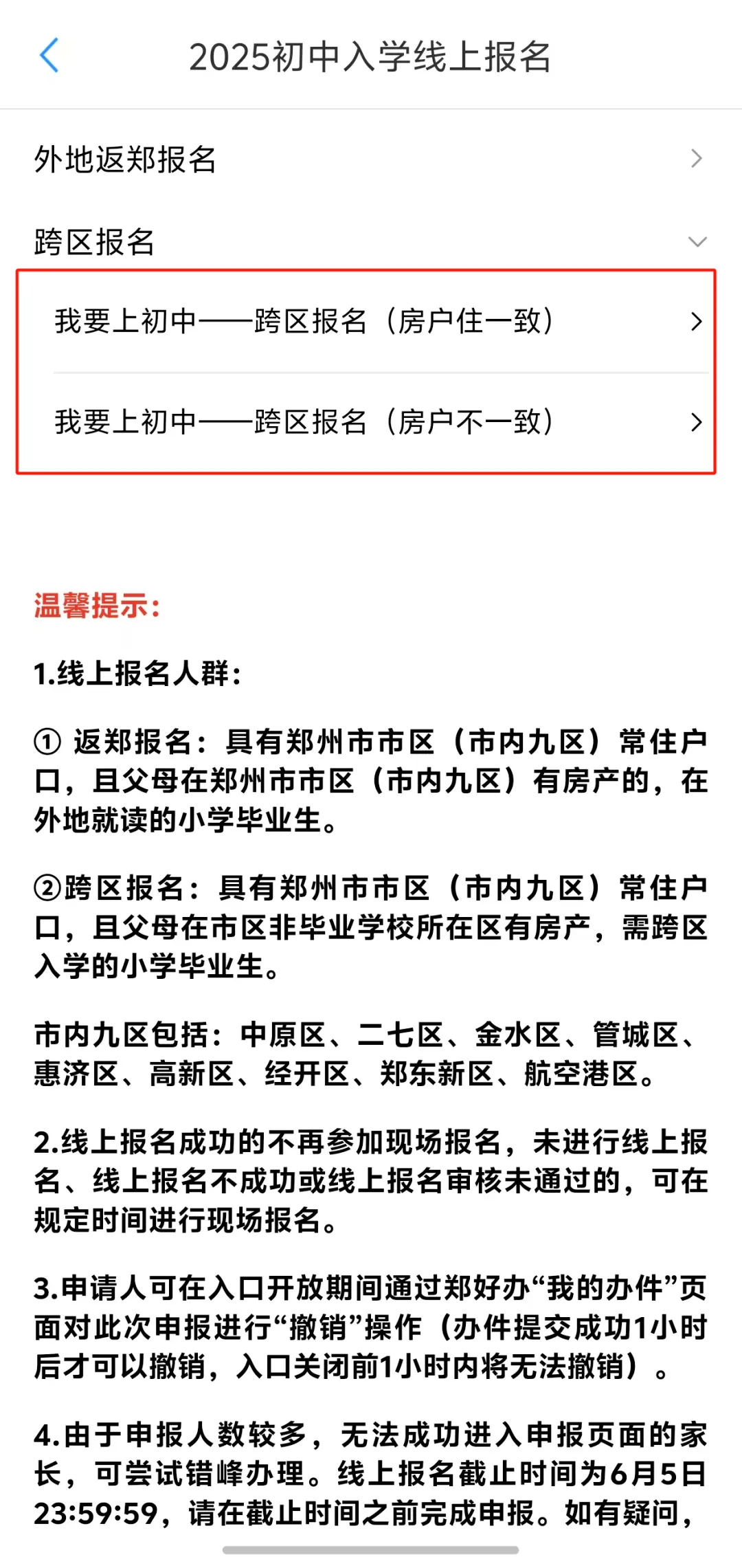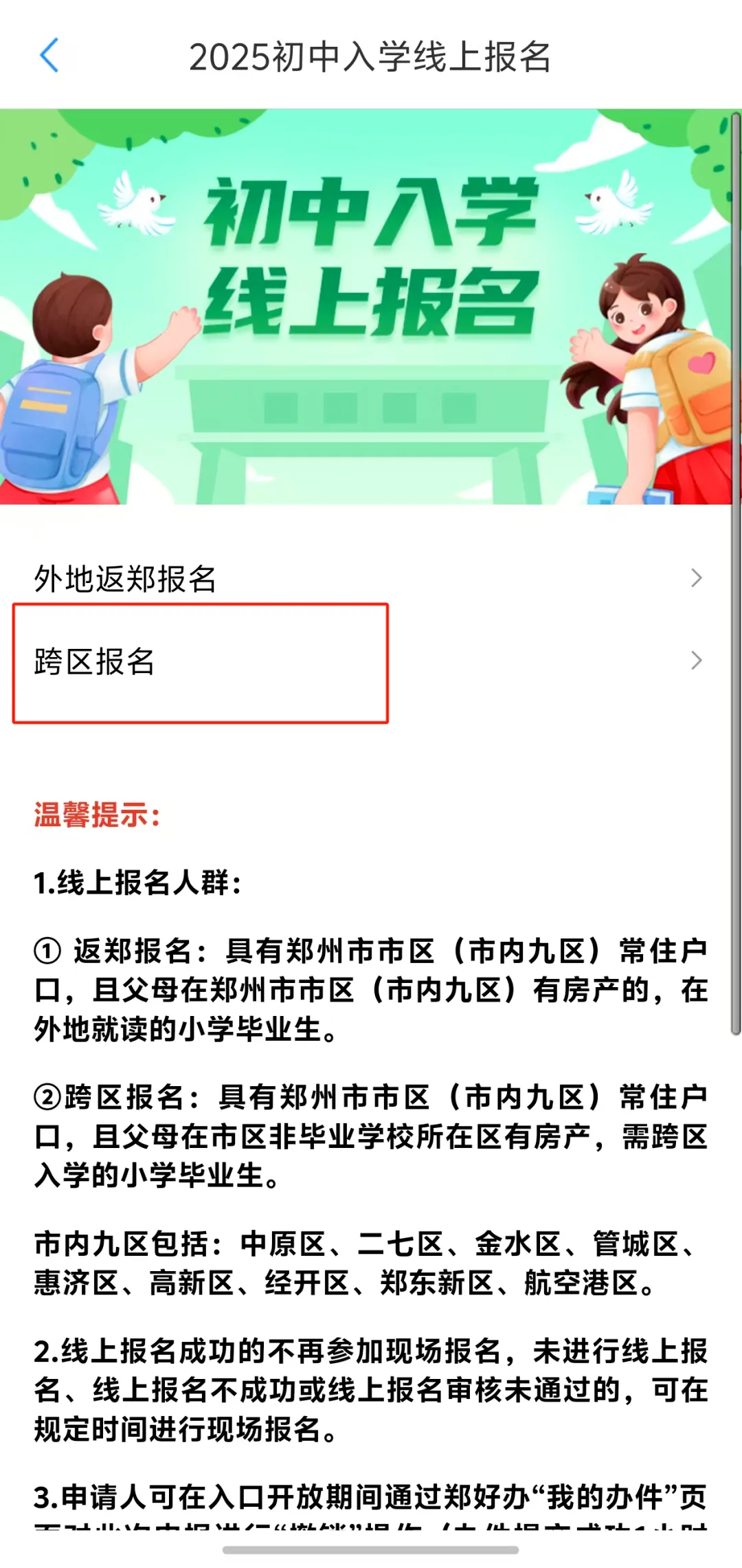 ①下载并登录“郑好办”APP,点击首页“初中线上报名”,选择“线上跨区报名”。