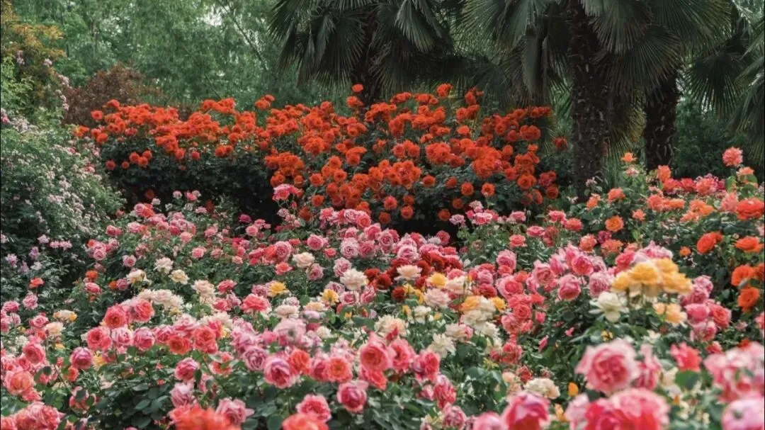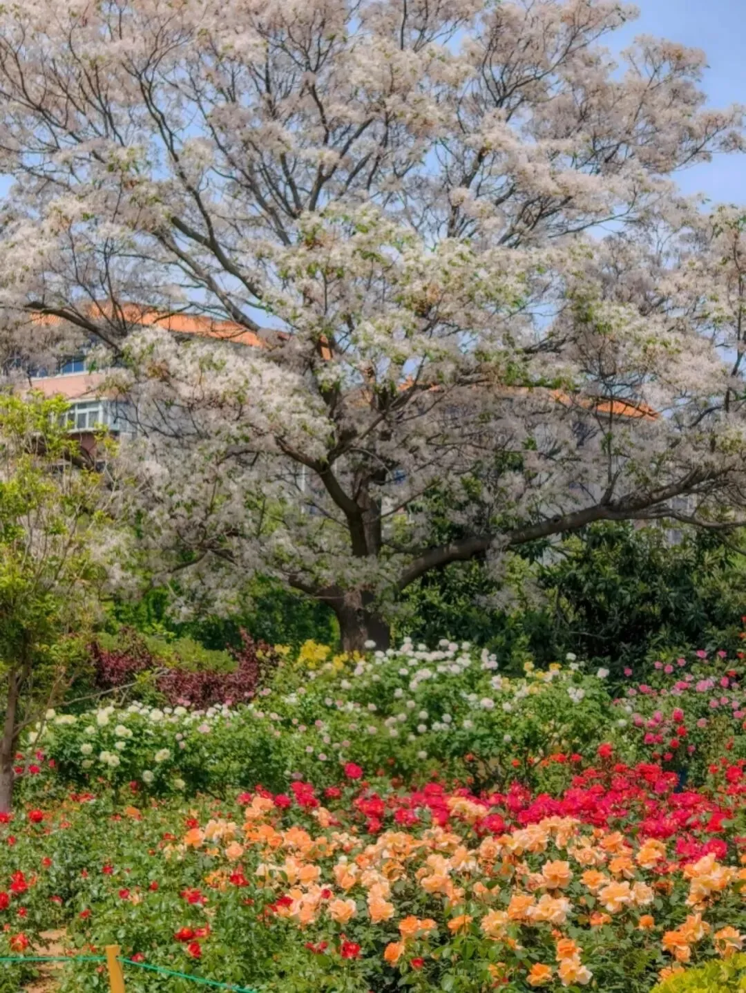 若说前面的景致是“诗意小品”,那么月季花海矩阵便是“色彩狂想曲”。在柔雾紫的苦楝树下,从浅粉、柔黄到艳红、橘橙,数十种月季铺满视野,像打翻的调色盘。每一朵花都有自己的姿态,却又和谐共生,让人忍不住沉醉于这场“色彩的狂欢”。