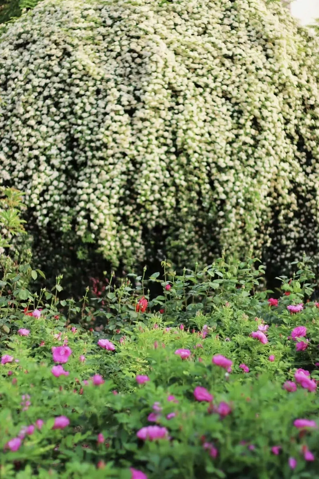二、七里香瀑布×粉月季:层次美学,顶流的“视觉王炸”转过街角,七里香的“花瀑”猝不及防闯入视野:无数小白花密密匝匝垂落,像银河倾泻,又似繁星缀满绿枝,柔得能掐出水来。下方花圃里,粉月季正热烈绽放——红的热烈、粉的柔婉,与七里香的素白层层叠叠,铺成一幅鲜活的春之油画。