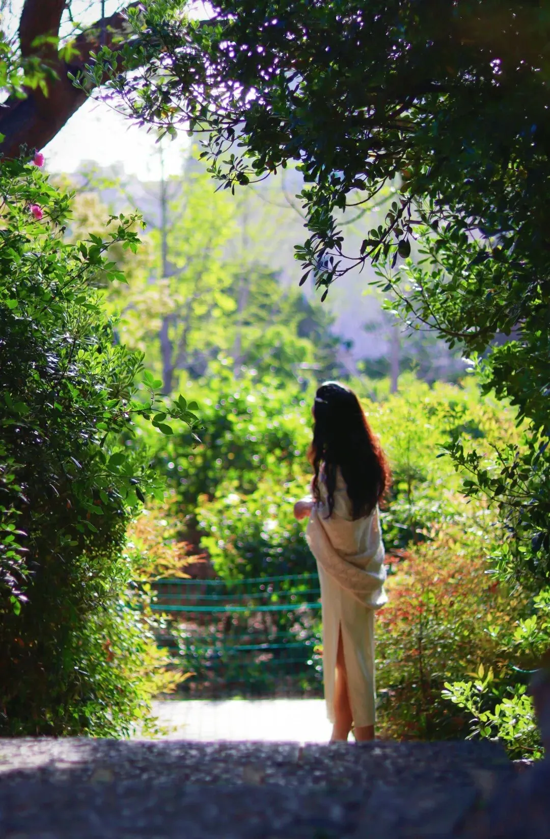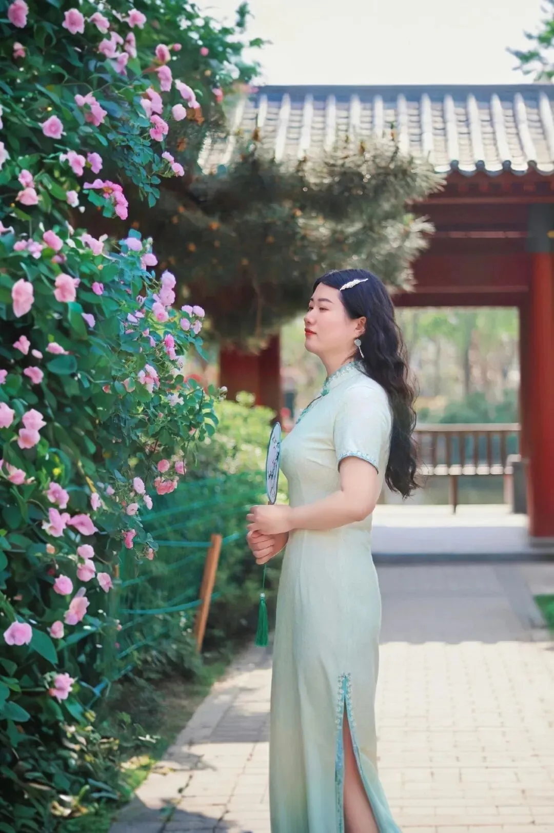 园中的红柱飞檐、青砖小径、水榭亭台,是天然的“氛围感担当”。我身着浅绿色旗袍,立于粉花绿蔓间,盘扣、流苏、刺绣与花木光影交织——传统与时尚在此和解,人与景彼此成就,每一帧都像从古风画册里走出来的场景。哪怕只是背影,长发披肩、素裙曳地,走在花木掩映的小径上,都自成一幅“人在画中游”的治愈图景。阳光透过叶隙洒下,给发丝镀上金边,连风都变得温柔,仿佛整个公园都在为这份“中式浪漫”低吟浅唱。