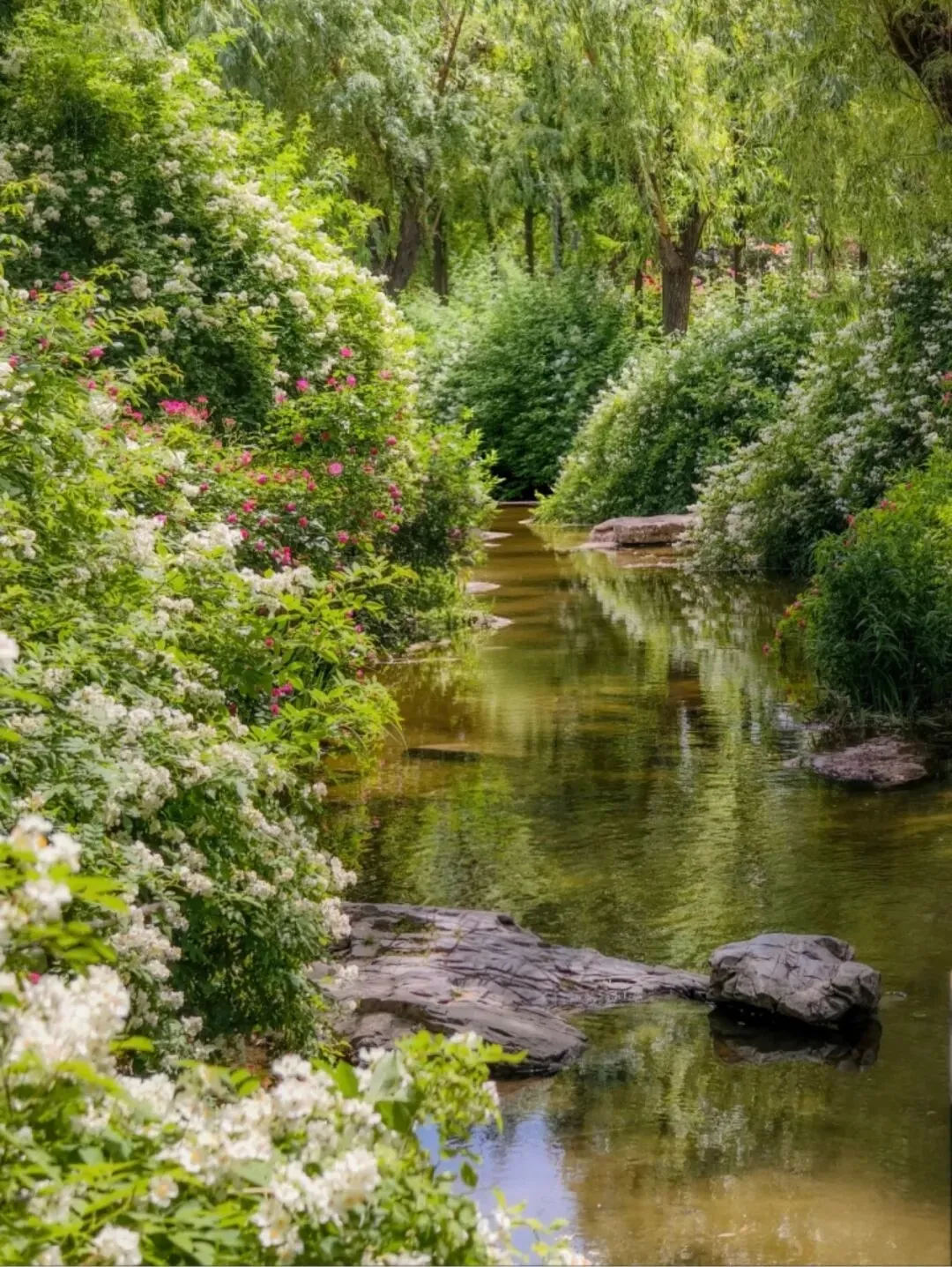 沿着小径深入,溪流、花瀑构成另一重治愈画面。溪水潺潺,两岸白花如雪、绿藤缠枝,身后是层层叠叠的花墙,前方是波光粼粼的水面。那一刻,所有烦恼都被花香滤净,只剩心底的柔软在发芽——这是月季公园独有的“情绪魔法”,让你在花海中找回内心的宁静。
