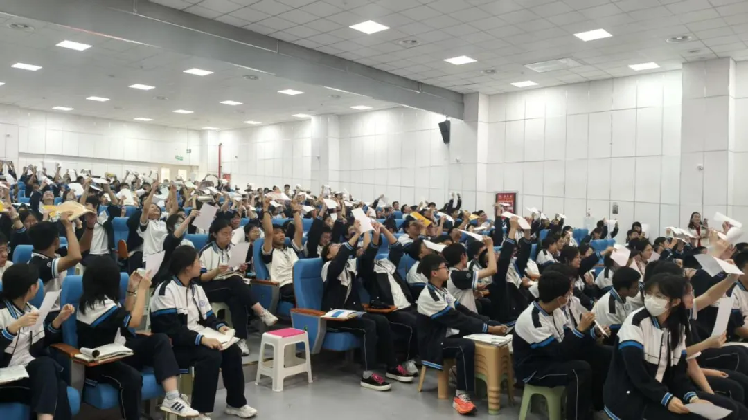 励志分享环节,梁君林老师结合自身求学经历与成长故事,传递坚持不懈、勇于突破、永不言弃的学习精神。他鼓励学生正视学习挑战,树立清晰目标,以饱满热情与坚定信念投入学习,将英语学习化为自我提升、追逐梦想的强劲动力。现场学生全神贯注、积极响应,齐声跟读、踊跃互动,铿锵有力的朗读声回荡报告厅,尽显六高学子朝气蓬勃、奋勇争先的精神风貌。