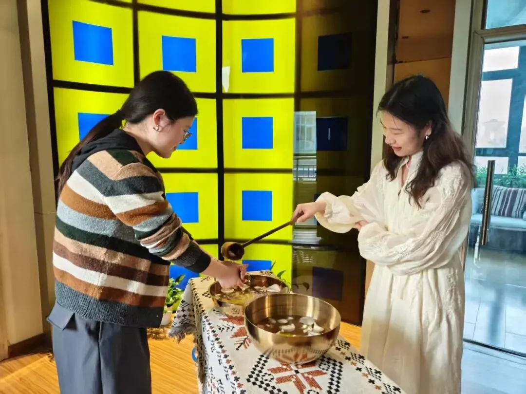 在舒缓的音乐中,沙龙依次展开身体扫描、情绪释放、颂钵疗愈、能量地图绘制、石头祝福等环节。老师们在引导下进行深呼吸与身体放松,把紧绷的神经慢慢舒展;在“我受够了”情绪释放仪式中,大家勇敢写下心声,将负面情绪投入“情绪回收站”,完成一场温暖的情绪告别。伴随着颂钵空灵的声响,老师们戴上眼罩,与内在小孩对话,在安静与包容中拥抱内心、抚慰心灵。