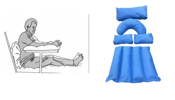患侧肩臂:在肩下和上臂下垫枕,使肩膀微微前伸,手臂外展,手心向上,手指自然伸开。