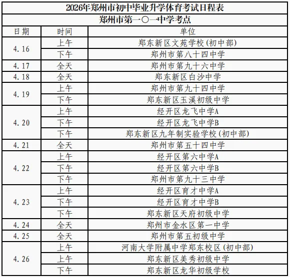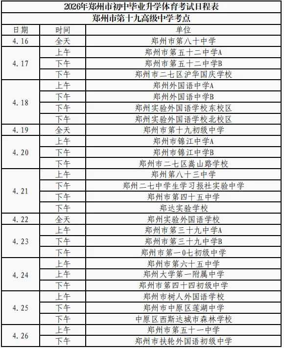 根据政策安排,今年,郑州市中招体育考试在2026年5月30日之前进行完毕,郑州市内十区中招体育考试时间从2026年4月16日开始。