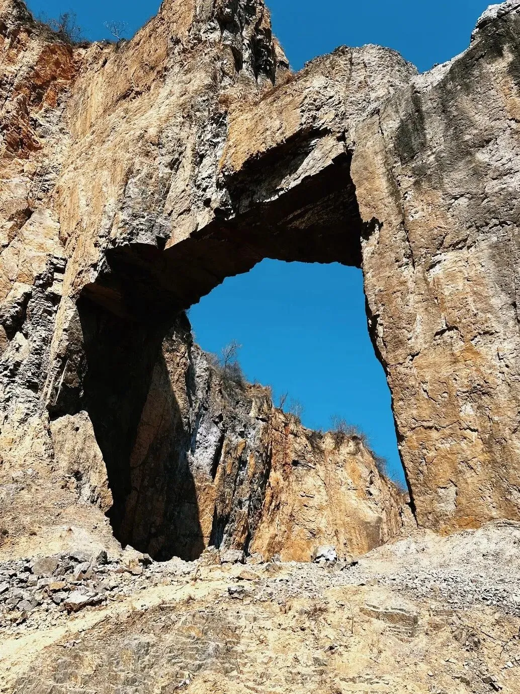 再步行约500米,就可到达石门天窗,这是采石留下的天然孔洞,形如天空之门,用无人机航拍能捕捉到震撼的垂直视角。