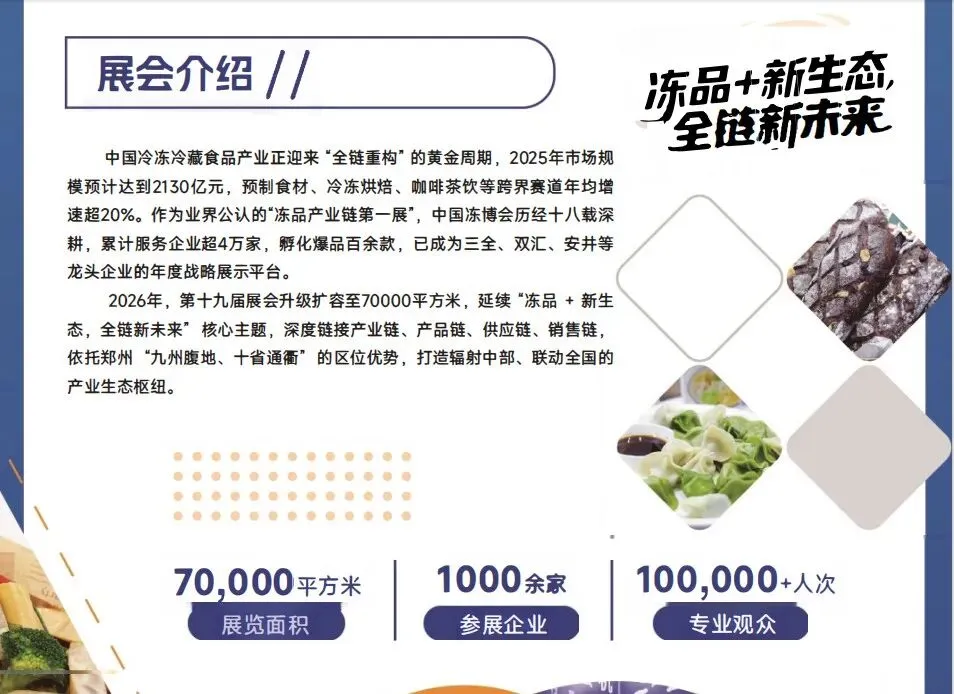 "2026郑州冷冻冷藏食品展汇聚行业龙头,展示低温保鲜、智能温控等前沿技术,搭建冷链全产业链对接平台。郑州优越的物流枢纽优势与千家企业参展阵容,将为您开启全球市场合作新机遇