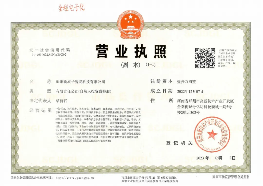 郑州新质子智能科技有限公司,一站式数智化平台服务商,是国家高新技术企业和双软认证企业,全国科技型中小企业,具备 AAA 级信用企业认证证书,1S09001质量管理体系认证、知识产权管理体系认证证书,以及多项软件著作权登记证书和专利证书。