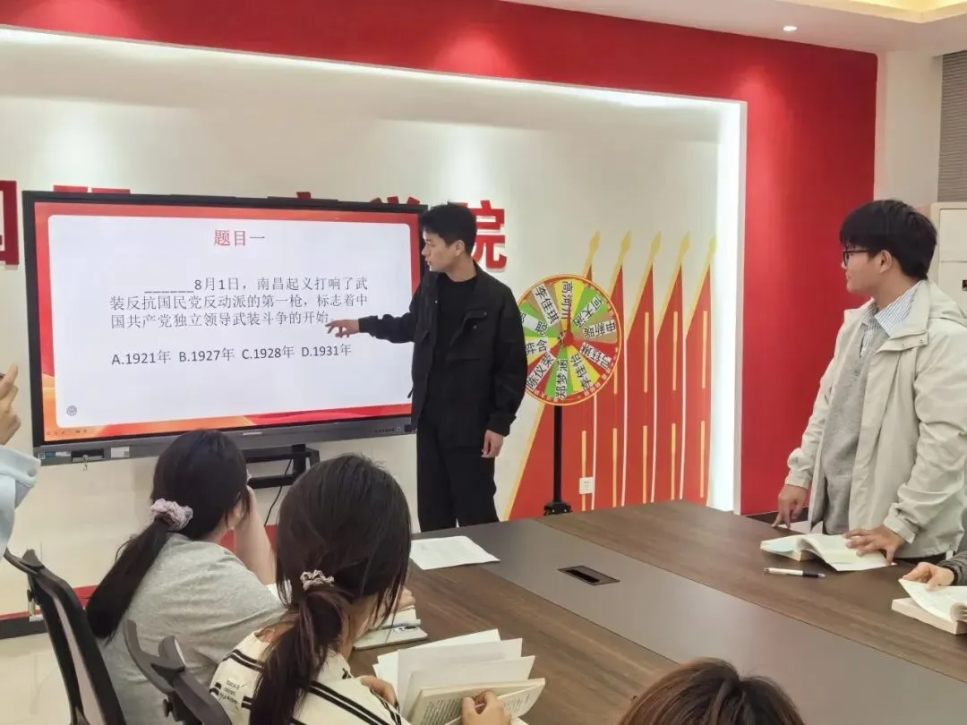 活动正式开始前,现场组织了“党史知识轮盘问答”热身环节,通过轮盘随机抽取5名同学回答与《中国共产党简史》相关的五个问题。被抽中的同学沉着应答,台下同学认真聆听,现场气氛紧张而热烈。该环节不仅检验了大家对党史基础知识的掌握情况,也激发了同学们进一步阅读的兴趣。