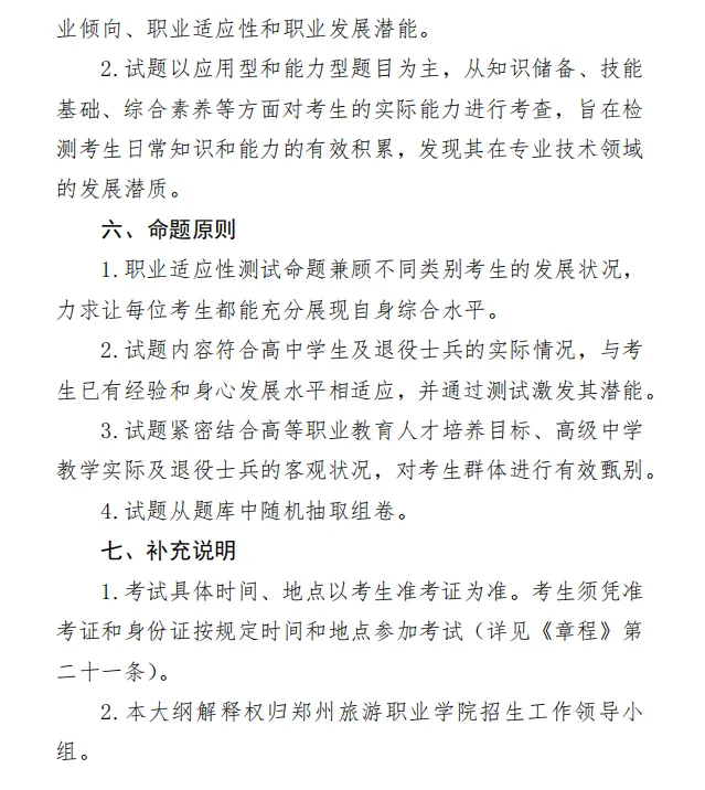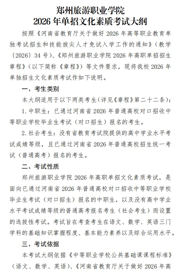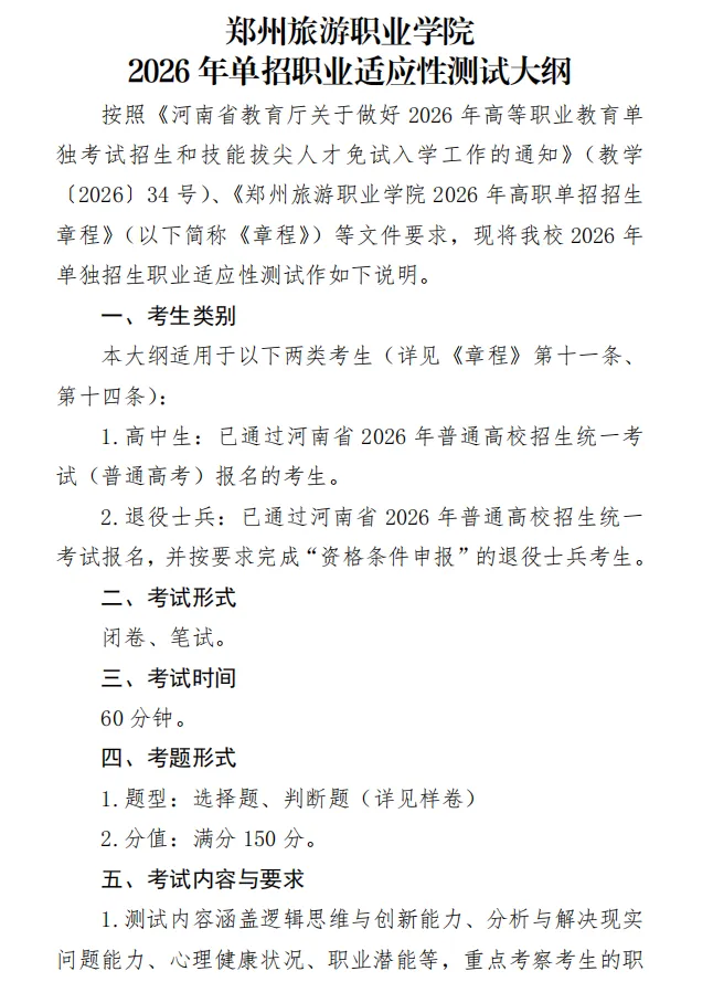 同学们大家有好,今天作者给大家汇总整理的资料是郑州旅游职业学院2026年单独招生考试大纲,需要的同学可自行下载打印。【点击下载完整版】按照《河南省教育厅关于做好2026年高等职业教育单独考试招生和技能拔尖人才免试入学工作的通知》(教学〔2026〕34号)、《郑州旅游职业学院2026年高职单招招生章程》(以下简称《章程》)等文件要求,现将我校2026年单独招生职业适应性测试作如下说明。