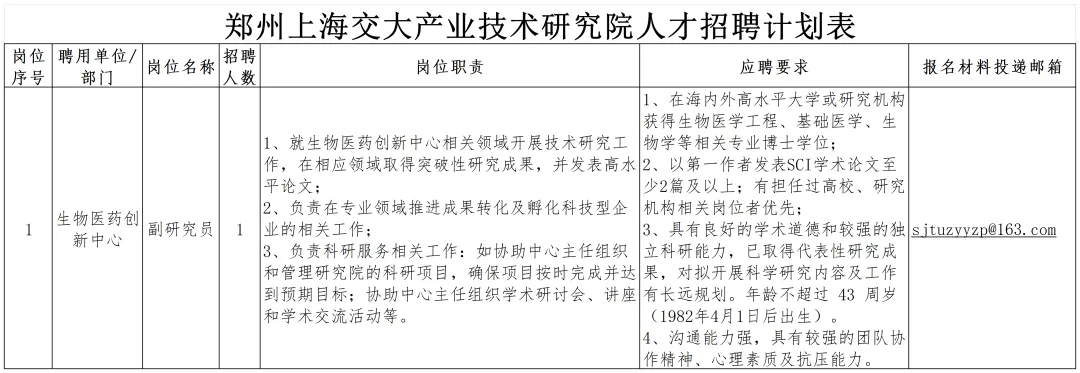 详见《郑州上海交大产业技术研究院人才招聘计划表》(附件1)。