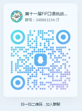 现将公布晋级名单,就在下方链接里为大家完整呈现!请所有成功晋级的同学,一定要第一时间扫描下方QQ群二维码(QQ群号:348863154),火速加入“第十一届FiF英语口语大赛复赛群”。后续关于复赛视频提交的具体要求、详细的格式规范以及关键的截止时间等重要通知,都会在群里统一发布,大家千万不要错过重要信息哦!