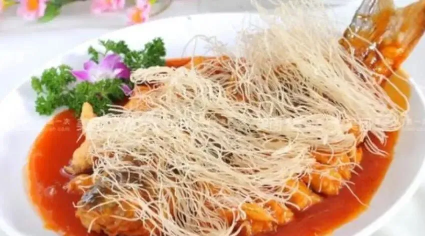 豫菜名菜,炸鲤鱼外酥里嫩,盖细如发丝的焙面,浇糖醋汁,酸甜适口、酥脆鲜香。