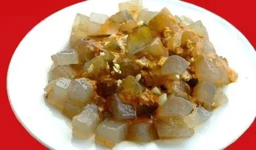 红薯淀粉+肉汤凝冻,可煎可炒可凉拌,口感Q弹软糯、咸香醇厚,中原传统年味小吃。
