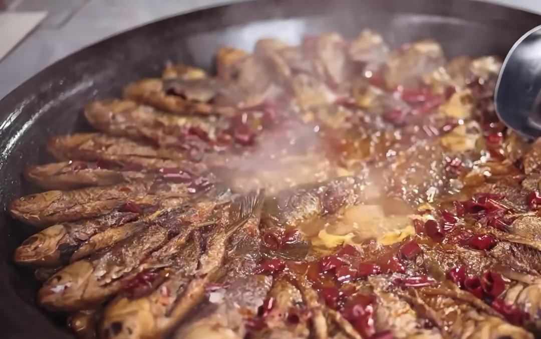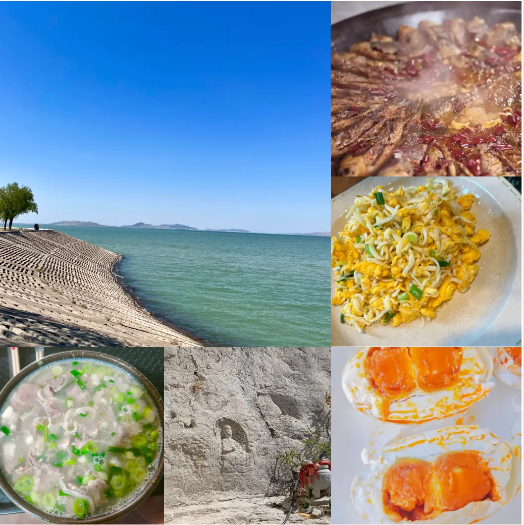 别去收费景区。沿着环湖路开,大段免费的野岸。中午随便找家门口停满本地车的农家院。糟鱼、银鱼炒蛋、一盆贴饼子。糟鱼炖得骨酥肉烂,酱香透着点甜。银鱼裹着蛋液刚过完油,烫嘴。