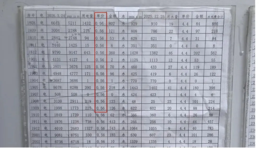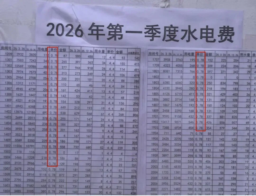 在3号楼电梯间的公示栏内,一张“2026年第一季度水电费”公示单清晰显示,电单价为0.78元/度;而在紧邻的2号楼公示栏中,电单价明确标注为0.56元/度,两栋楼电价差距直观可见。