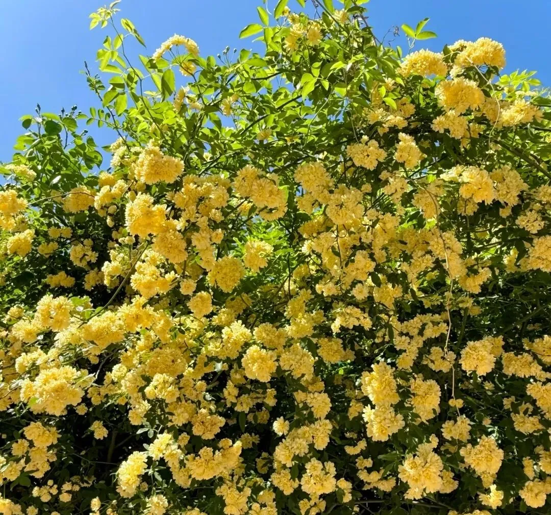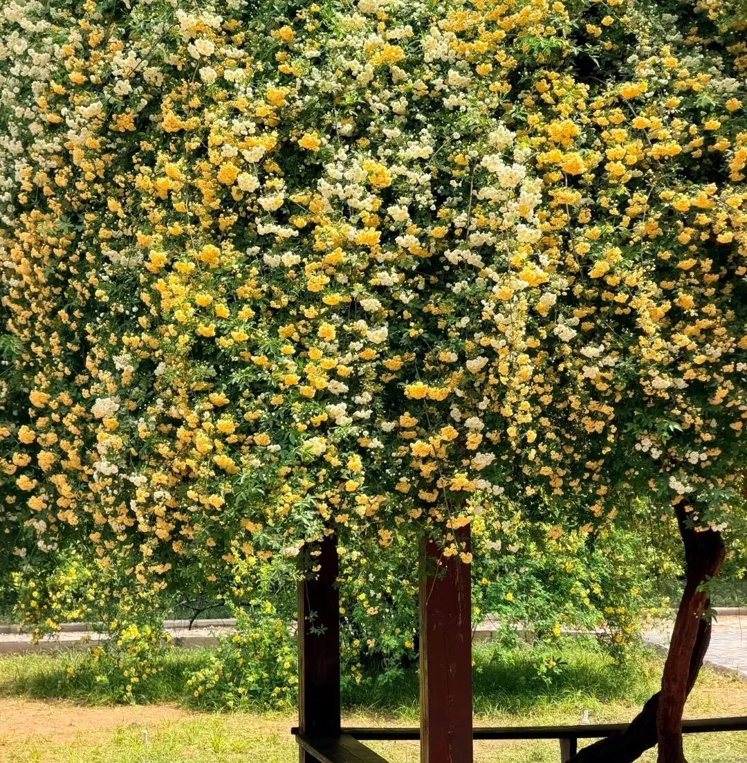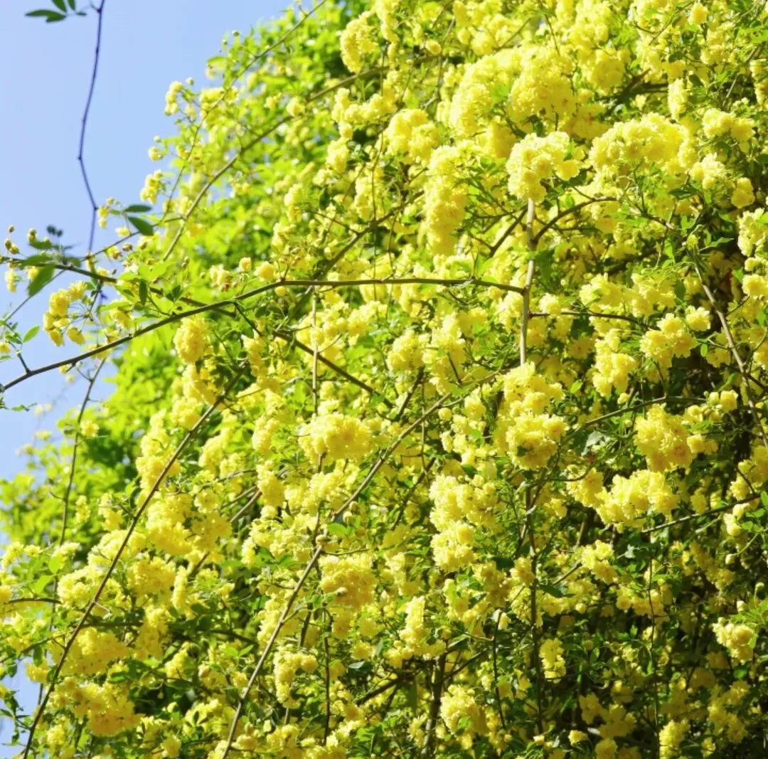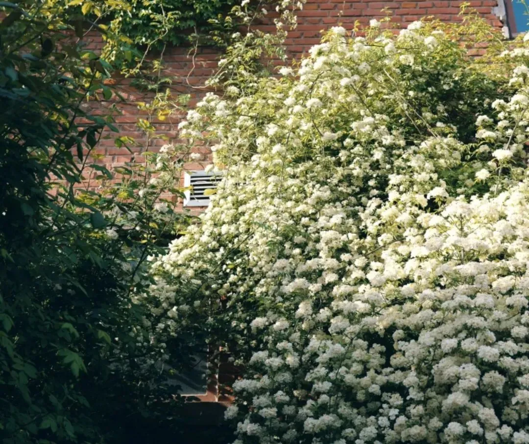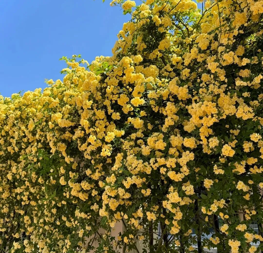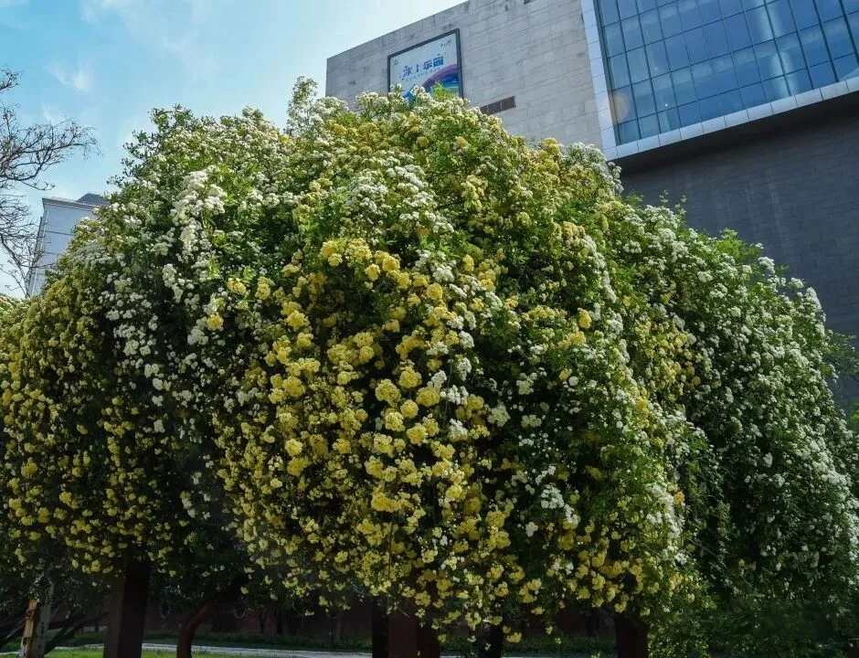 这里的木香花长势肆意,巨大的花瀑从枝头垂落,白色、黄色双色花株同框绽放,一眼望去,繁花似锦,氛围感直接拉满。