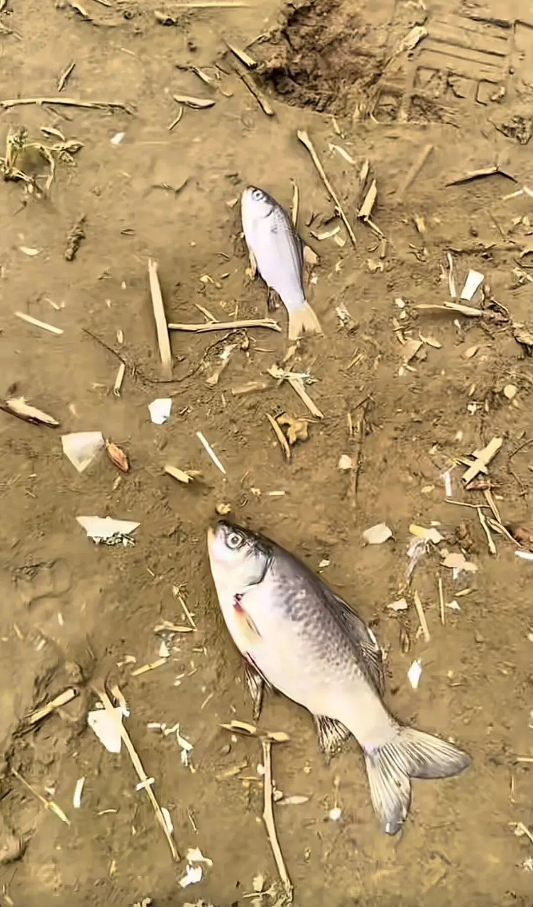 水库岸边土地上散落的死鱼 来源:视频截图