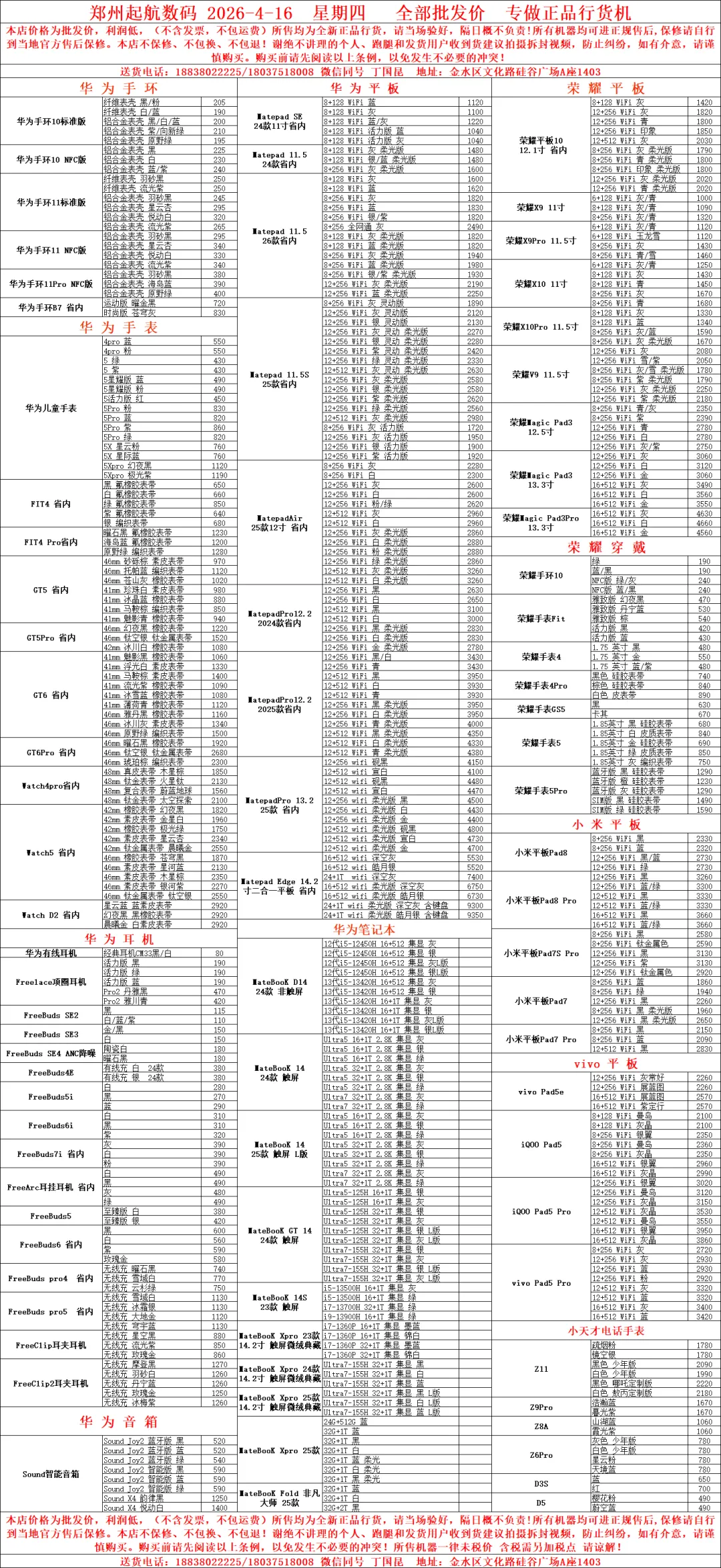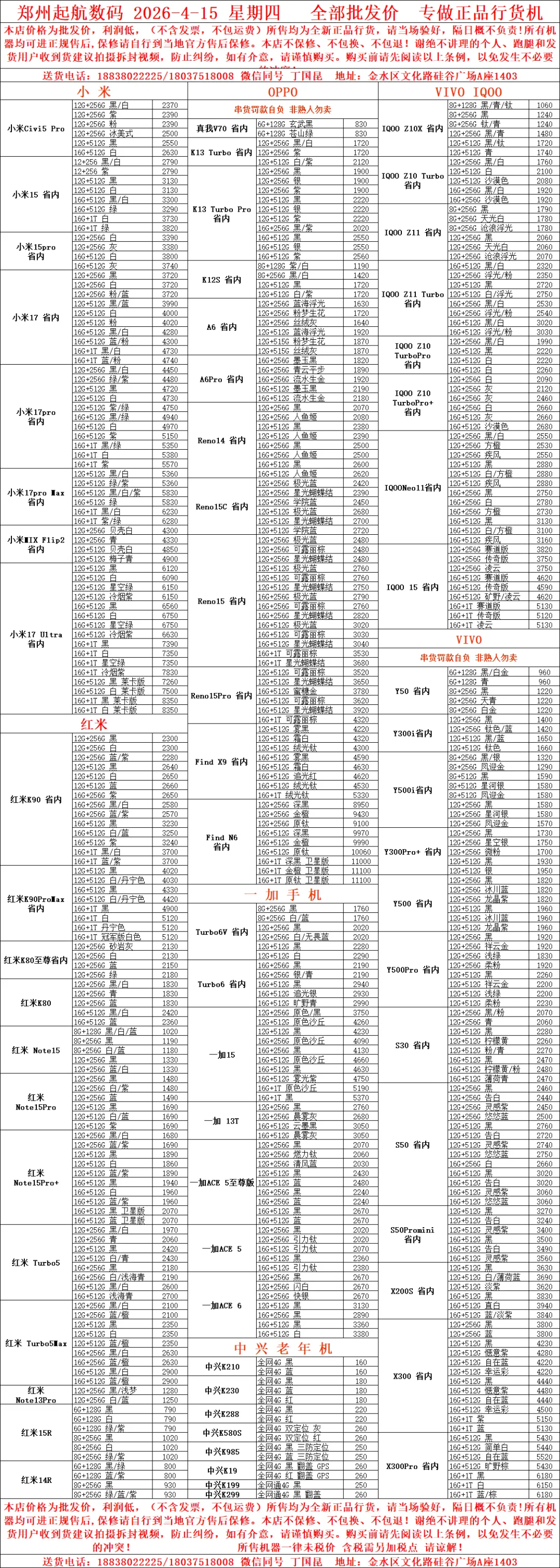 每天手机最新行情 请关注微信每日推送微信公众号:郑州起航数码公司地址:郑州市金水区文化路82号硅谷广场A座1403