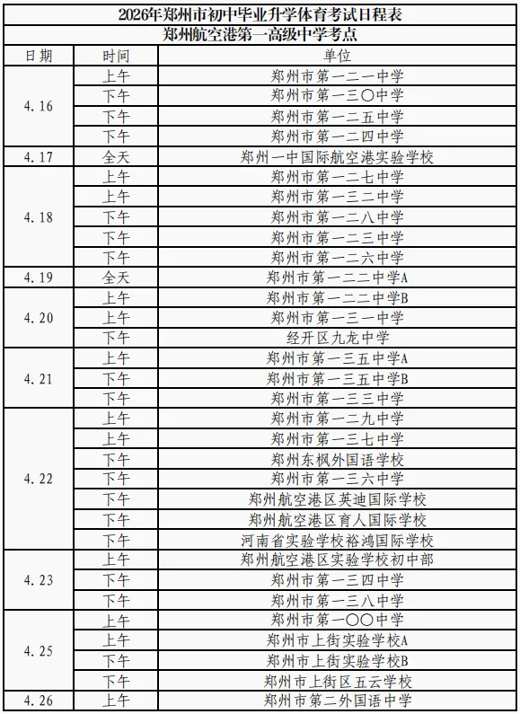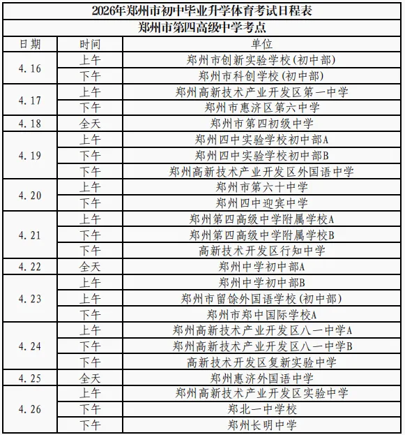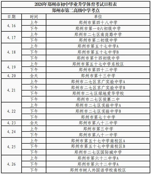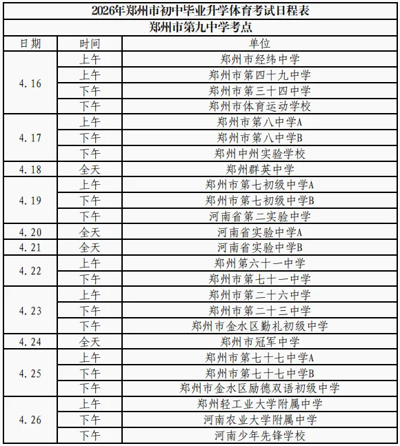 根据政策安排,今年,郑州市中招体育考试在2026年5月30日之前进行完毕,郑州市内十区中招体育考试时间从2026年4月16日开始。