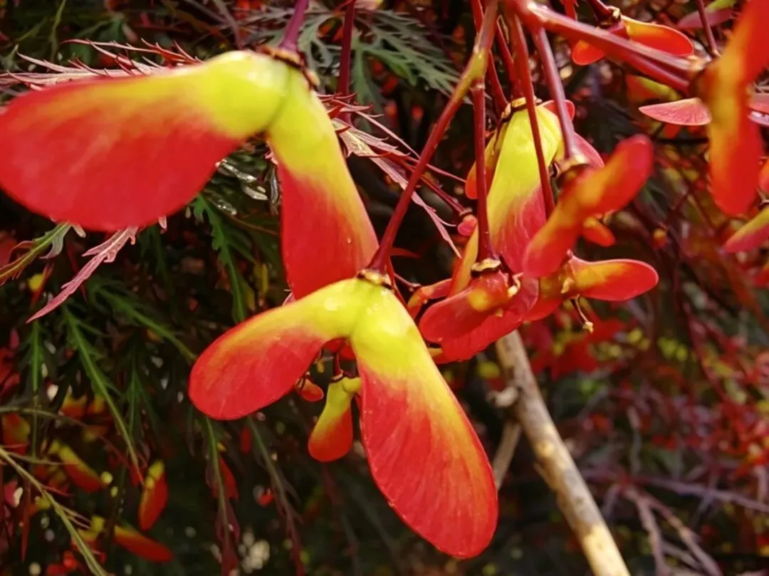 很多人只爱鸡爪槭秋日的红,却忽略了春日的翅果才是它的“隐藏彩蛋”。你看这嫩红的双翅,带着渐变的粉绿,风一吹就像要飞起来,这是它的果实,也是它传播生命的智慧。古人说“槭槭深染得秋林一色”,却不知春日的它,早已把浪漫藏在了枝头。从蚩尤弃桎梏化为枫木的古老传说,到唐宋文人笔下的离愁别绪,再到如今郑州园林里的四季常青,鸡爪槭从来都不只是一棵树,它是中国人的乡愁,是郑州城的诗意,是跨越千年依然鲜活的文化印记。